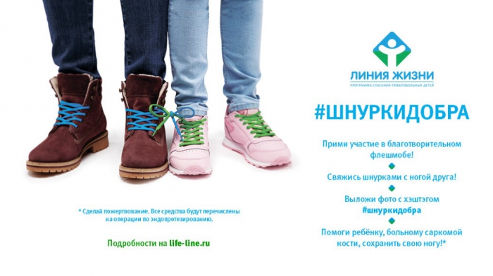 «Мы хотим, чтобы живая энергия людей помогла сохранить жизнь детям, которым поставлен диагноз костная саркома. Именно поэтому фонд «Линия жизни» запускает онлайн-флешмоб #шнуркидобра. Давайте сделаем так, чтобы как можно больше людей узнало о таких жизнеспасающих операциях», – сообщает президент фонда «Линия жизни» Фаина Захарова.
