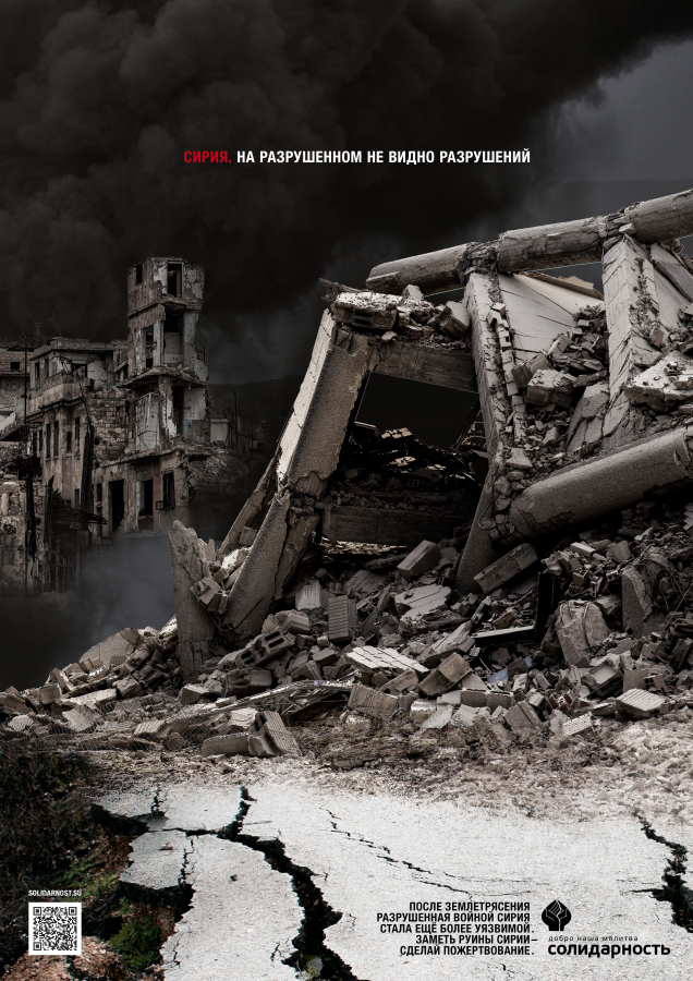 Серия постов для социальных медиа и печатная реклама призывают обратить внимание на последствия землетрясения, которые наложились на разрушения от военных действий, а также сделать пожертвование фонду «Солидарность», организующему помощь пострадавшим от землетрясения в Сирии.
