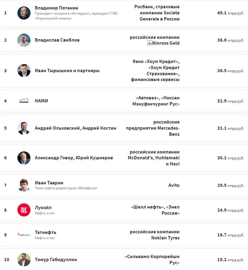 Первое место в топ-25 занял Владимир Потанин, который приобрёл активы «Росбанка» у французской Société Générale. На втором месте — Владислав Свиблов, владелец российского бизнеса канадской Kinross Gold, а замыкает тройку лидеров — Иван Тырышкин, вместе с партнёрами владеющий банком «Хоум Кредит».