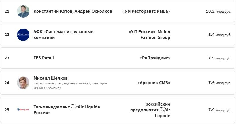 Также в рейтинге оказались владельцы иностранного бизнеса по производству автомобилей, электроники, а также сетей фастфуда (Александр Говор, который управляет сетью «Вкусно — и точка») занял шестое место, а совладельцы российских активов Yum! Brands Константин Котов и Андрей Осколков заняли 21-ю строчку.
