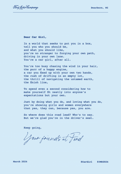 Американский автопроизводитель Ford Motor Company совместно с агентством Wieden+Kennedy New York запустил рекламную кампанию «CarGirl», посвящённую Международному женскому дню. Автобренд написал вдохновляющее письмо всем женщинам, «которые любят автомобили», призвав их продолжать демонстрировать свою страсть к автомобилестроению, преодолевать ограничения, прокладывать новые пути и строить планы.