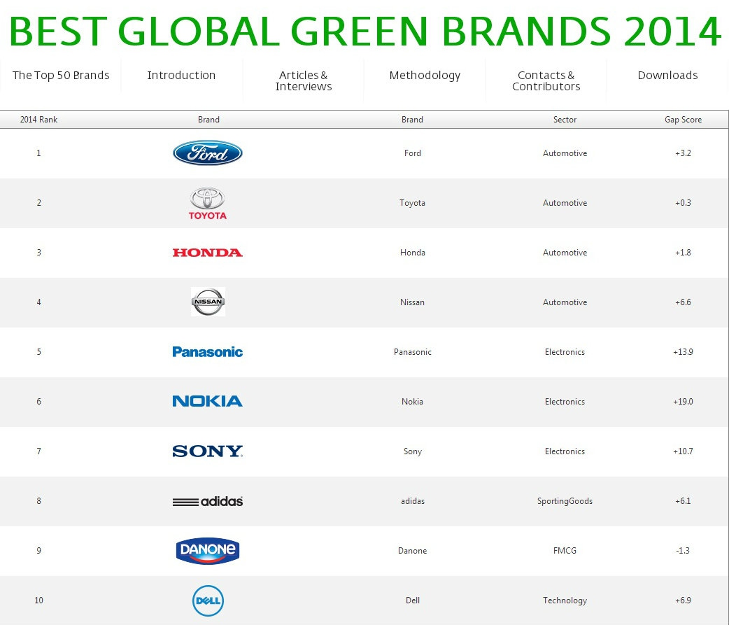 Компания Interbrand опубликовала рейтинг наиболее экологичных торговых марок. ТОП-50 «зеленых» брендов возглавил автопроизводитель Ford, который занимал вторую позицию в списке 2013 года. На его место встала Toyota, а Honda по-прежнему замыкает тройку лидеров.