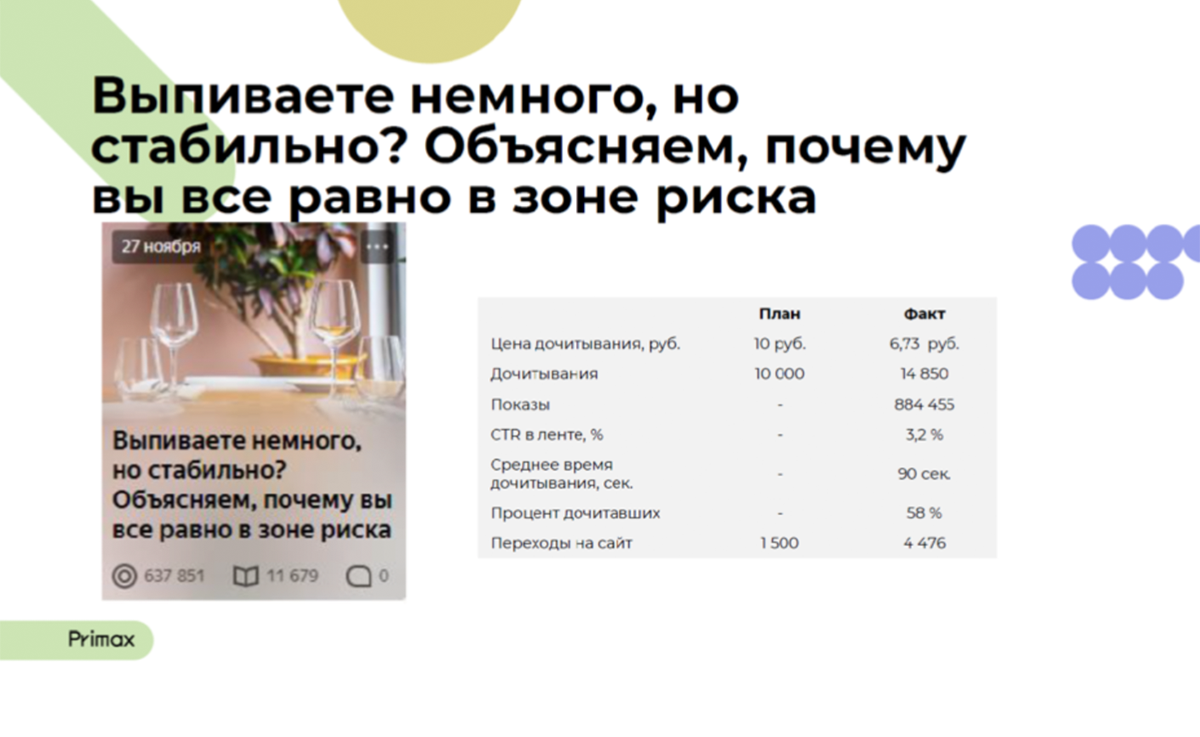 В «Яндекс.Дзене» по уже завершенному проекту написаны статьи в разных жанрах: чек-лист, юзеркейс, образовательный формат. По всем материалам отличные показатели, но лучше всего «зашел» материал «Выпиваете немного, но стабильно? Объясняем, почему вы все равно в зоне риска».