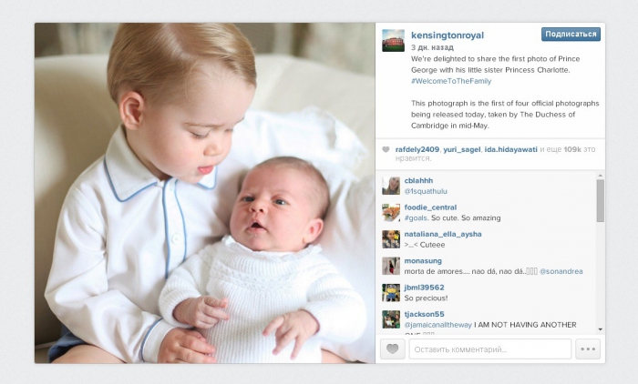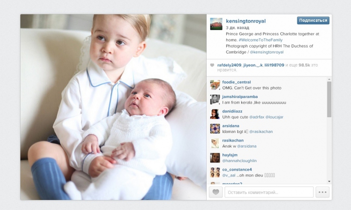Первые официальные совместные фотографии детей герцога и герцогини Кембриджских Уильяма и Кэтрин – новорожденной принцессы Шарлотты и принца Джорджа, которые недавно обнародовал Кенсингтонский дворец, буквально за считанные часы взорвали интернет.