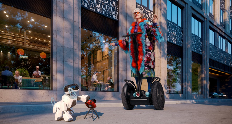 Визуальным отражением такой идеи стала бабушка на гироскутере (модель Галина Сокольская), живущая на волне со временем, которую фотографирует её современный питомец, японская собака-робот. По словам модели, это её первая работа для компании-застройщика. «Я был рад, что эту идею согласовали, теперь это одна из моих любимых картинок» — признаётся Иван Пичугин.