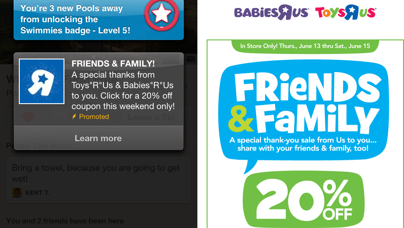 Реклама в приложении также будет полезна ритейлерам, которые заинтересованы в привлечении новых покупателей. Еще одним клиентом Foursquare стала сеть магазинов для детей Toys R Us/Babies R Us. Ее реклама показывается после чекина пользователя в парке, на детской площадке и подобных местах. Компания предлагает воспользоваться 20-процентной скидкой на товары.