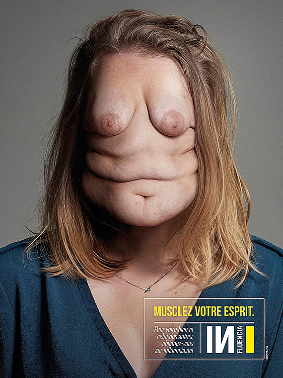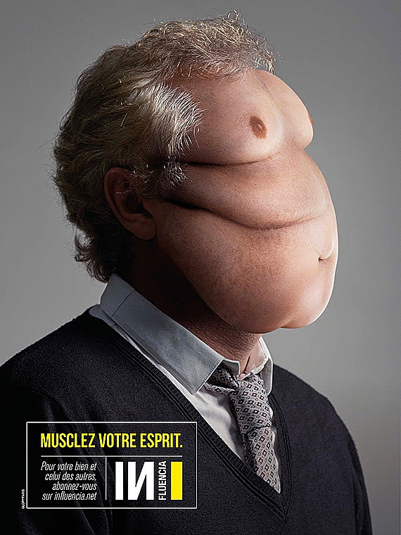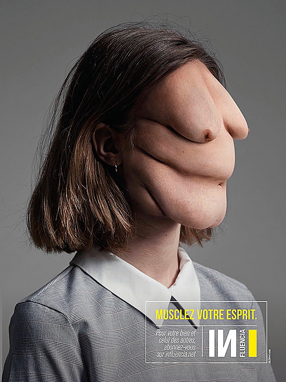 Французские журналисты и креативщики объявили войну «информационному ожирению». Для того, чтобы обратить внимание на проблему современности читателей, французский медиа-портал Influencia совместно с рекламщиками Glory Paris запустили шокирующую рекламную кампанию которая призывает - «Накачайте ваши мозги!».