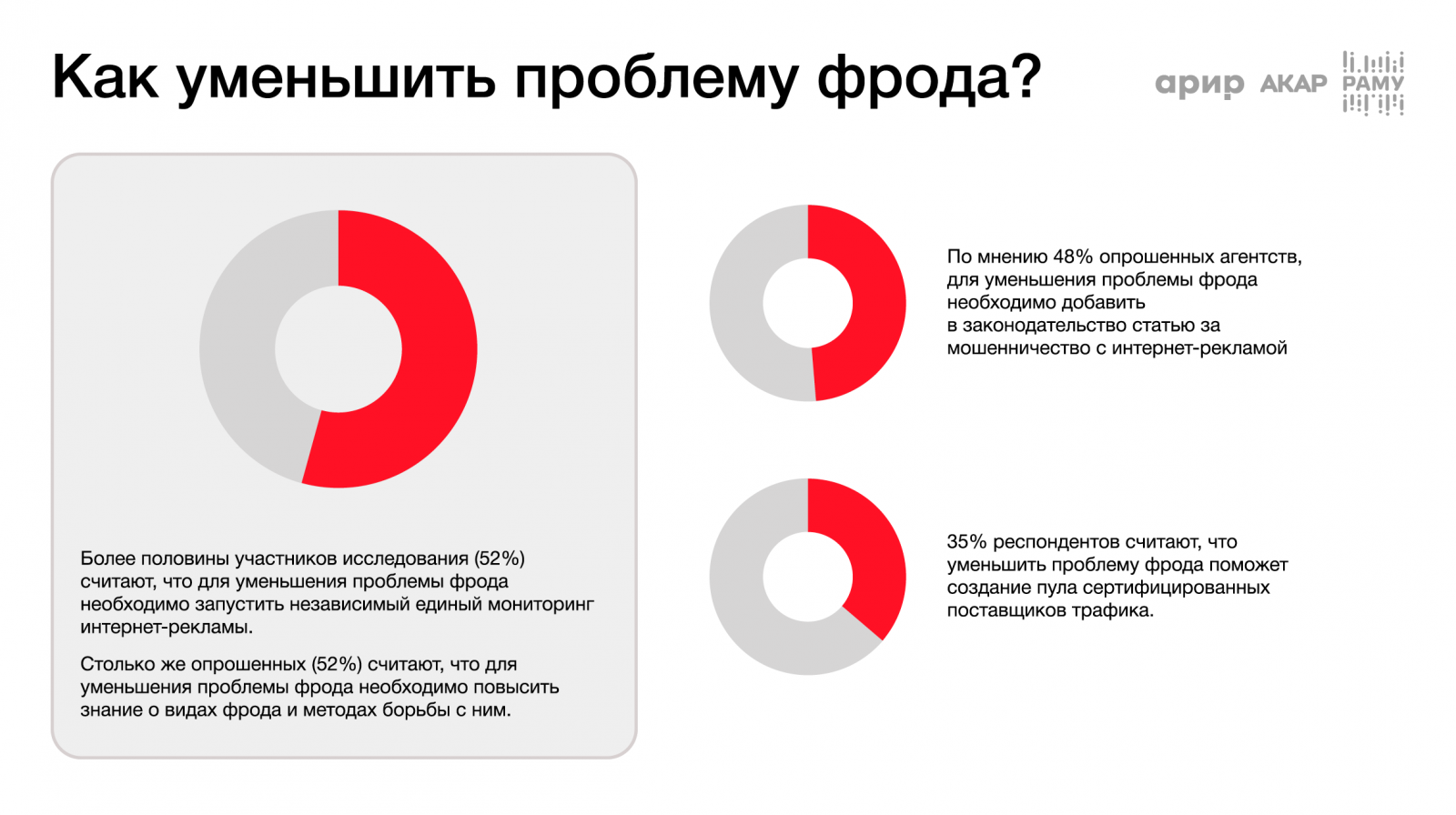 Агентства предлагают внедрить в деятельность рынка и другие способы борьбы с фродом. Более половины участников опроса (52%) считают, что для уменьшения проблемы фрода необходимо запустить независимый единый мониторинг интернет-рекламы. Столько же опрошенных (52%) уверены, что нужно повысить знание о видах невалидного трафика и методах борьбы с ним. Кроме этого, 35% представителей агентств считают, что справиться с проблемой поможет создание пула сертифицированных поставщиков.