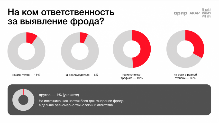 Практически половина участников опроса (49%) считают, что обязательства по выявлению фрода в рекламных кампаниях должен выполнять источник трафика. По мнению трети респондентов (32%), все участники рекламного процесса ответственны в равной степени.