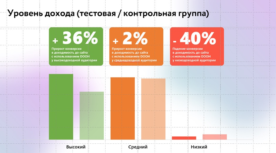 - Для аудитории с высоким уровнем дохода разница показателей в тестовой и контрольной группе составила 36%, у аудитории со средним доходом — 2%.