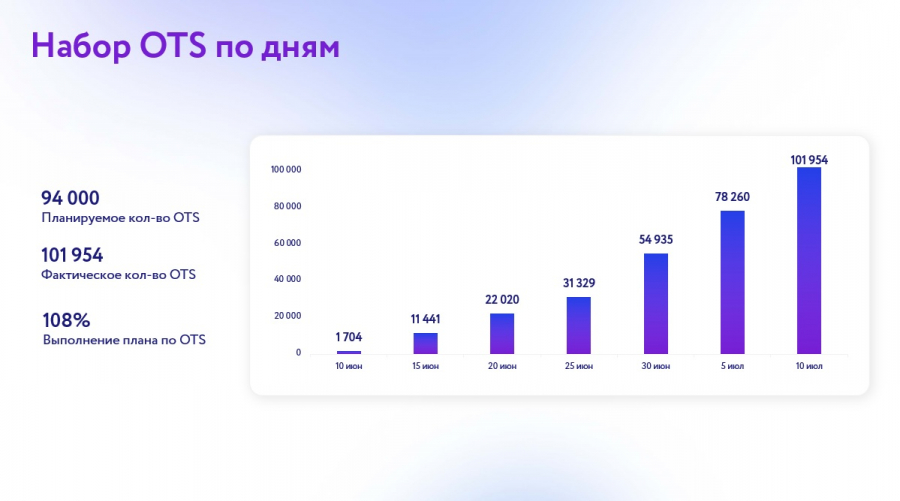 Кампания платформы «Финуслуги» проходила в Москве на 139 цифровых поверхностях оператора Gallery с 10 июня по 10 июля. Планируемое количество OTS находилось на уровне 94 тыс., этот показатель был перевыполнен, приблизившись к отметке в 102 тыс. OTS.