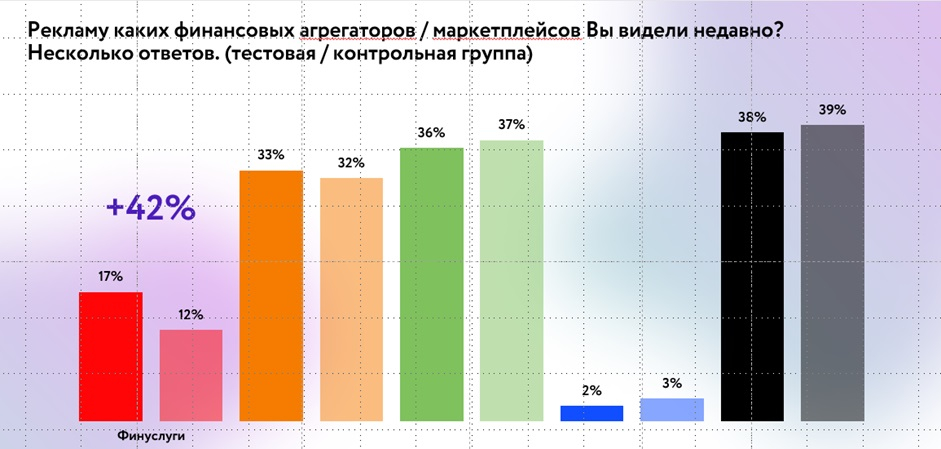 Участникам задавали вопрос: «Рекламу каких финансовых агрегаторов/маркетплейсов вы видели недавно?». Среди видевших креативы платформы бренд «Финуслуги» называли в 17% случаев против 12% в контрольной группе. По оценке специалистов, наружная реклама увеличила знание бренда на 42%. Исследование производилось по агрегированным статистическим отчётам, основанным на анализе технических средств, обезличенных данных о пользователях и ответов респондентов опроса.
