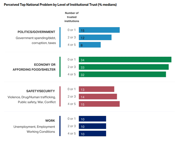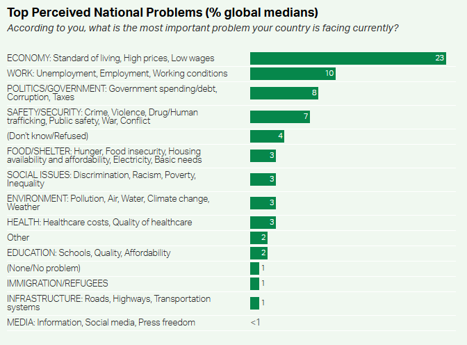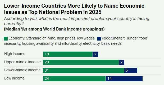 Люди, живущие в странах с низким уровнем дохода, где удовлетворение основных потребностей часто преобладает над другими проблемами, чаще всего называют экономические проблемы (экономику, доступ к еде и жилью) самой большой проблемой, стоящей перед их страной. В среднем 38% жителей стран с низким уровнем дохода называют экономические проблемы самой большой проблемой своей страны, что почти вдвое выше, чем 21% в странах с высоким уровнем дохода.
