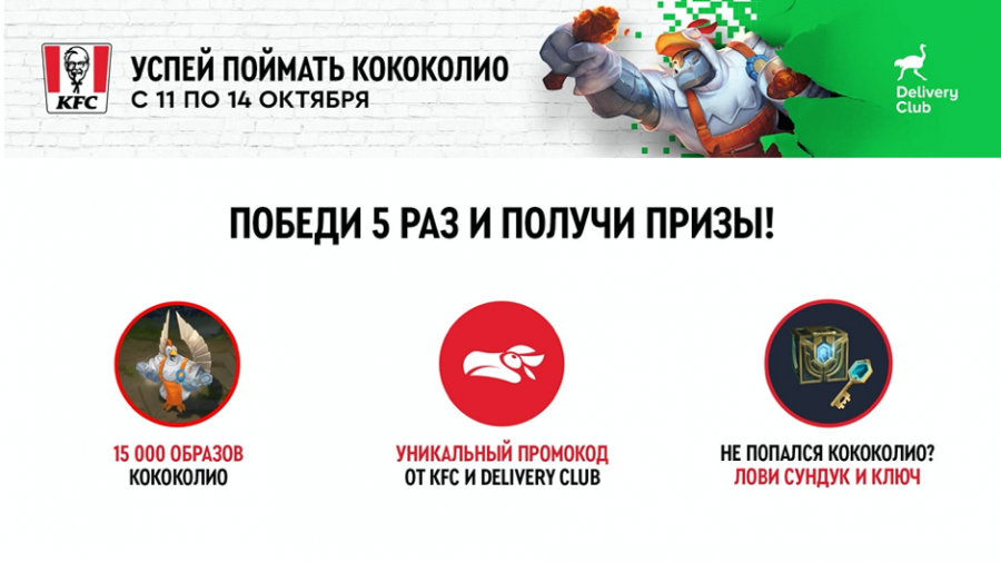 Например, в начале октября мы сделали с KFC и League of Legends проект «Успей поймать Кококолио». Мы разыгрывали скины и купоны на покупки в KFC в Delivery Club — обычная, но эффективная мотивация в игровом канале. Получилась околоигровая механика, которая сгенерировала заказы и вела из онлайна в онлайн.