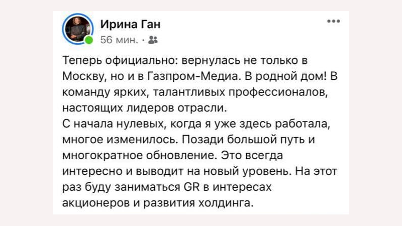 Ирина Ган получила должность в «Газпром-медиа», об этом она сообщила на своей странице в Facebook. Ган займется GR (Government Relations, взаимодействие с органами государственной власти) «в интересах акционеров и развития холдинга».