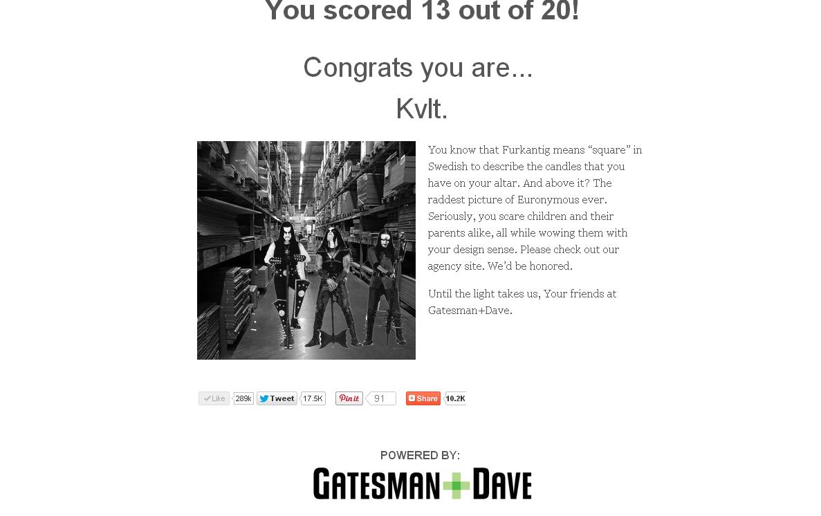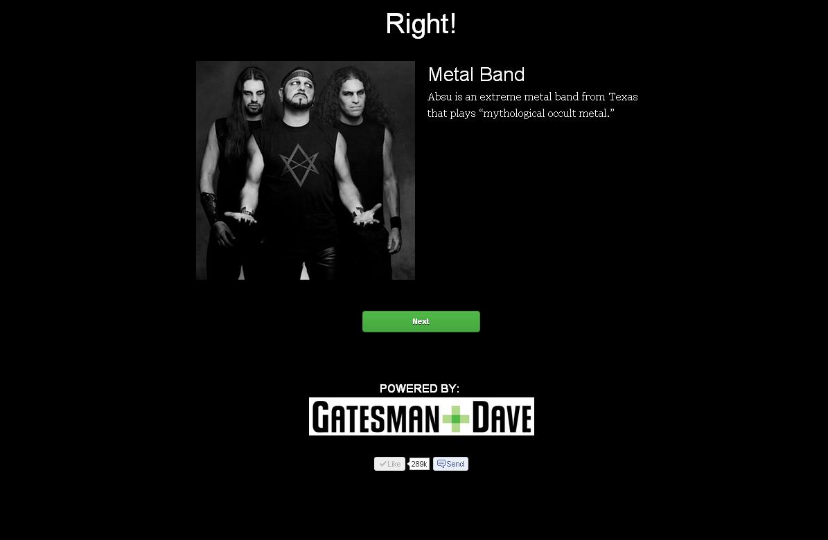Например, Absu - это группа из Техаса, которая играет в стиле под названием «мифологический оккультный металл», а Vittsjo- это название стеллажей IKEA.Так, если вы правильно ответили на 1 вопрос из 20, то результат Вашего теста был бы таким:«Вы бы не смогли отделать комнату или назвать песню, даже если бы ваша жизнь зависела от этого. Наш совет: слушать больше музыки купить много мебели»