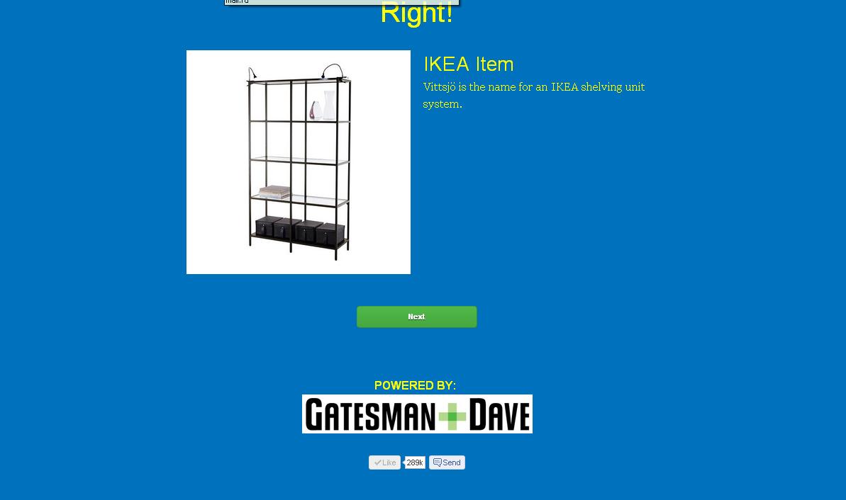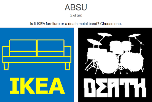 Викторина под названием «IKEA или смерть» предоставляет игроку название, по которому нужно опредеить, что это - музыкальная группа или предмет мебели. Предлагается ответить на 20 вопросов, результаты теста покажут, каковы ваши познания в музыке и каталоге IKEA.