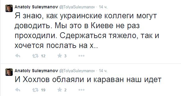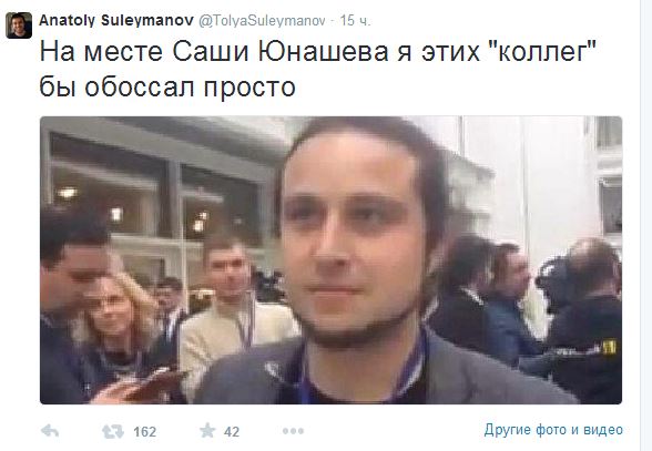 Главный редактор LifeNews Анатолий Сулейманов поддержал Юнашева. «Я знаю, как украинские коллеги могут доводить. Мы это в Киеве не раз проходили. Сдержаться тяжело, так и хочется послать», — написал он в Twitter. Отметим, что Юнашев является постоянным участником пресс-конференций с Владимиром Путиным. В 2013 году президент отметил его «провокационный вопрос», добавив, что он «в стиле вашего издания».