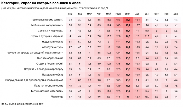 Многие категории, интерес к которым заметно увеличивается в июле, связаны с отпуском и путешествиями. Людей интересуют туры, круизы, холодильники для автомобилей и походные принадлежности. Растёт спрос на школьную форму, причём в июле более востребованы оптовые предложения, а в августе — розничные. Выпускники школ продолжают раздумывать, где продолжить учёбу, — теперь возрастает популярность высших учебных заведений. Популярны материалы для кровельных работ — черепица, рубероид и так далее.