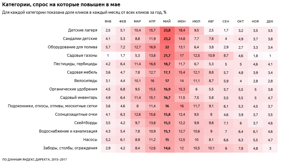 В весенне-летний сезон традиционно пользуется популярностью всё, что помогает организовать досуг: от дачного инвентаря и туристических путёвок до велосипедов и походных принадлежностей. Рунет не исключение: интерес к некоторым категориям год от года изменяется похожим образом. Аналитики «Яндекс.Директа» изучили данные за 2015−2017 годы и выяснили, какие категории пользовались повышенным спросом с мая по июль. Можно предположить, что в ближайшие три месяца эти товары и услуги снова будут особенно востребованы.
