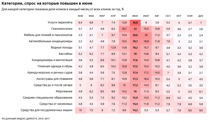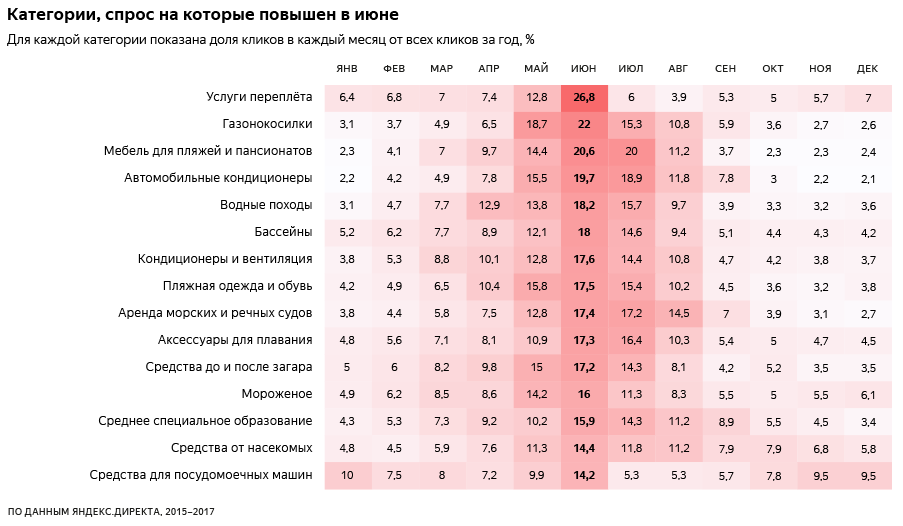 В июне становится жарче, повышается спрос на кондиционеры и мороженое. Растёт интерес к бассейнам, пляжной одежде, солнцезащитным кремам, а также к водным походам и прогулкам. Тем временем хозяева туристических бизнесов закупают мебель, а студенты готовятся к защите дипломов — резко возрастает спрос на услуги переплёта. Школьники выбирают, куда пойти учиться дальше, и присматривают колледжи. Дачники решают, что дальше откладывать борьбу с травой уже нельзя, и покупают газонокосилки.