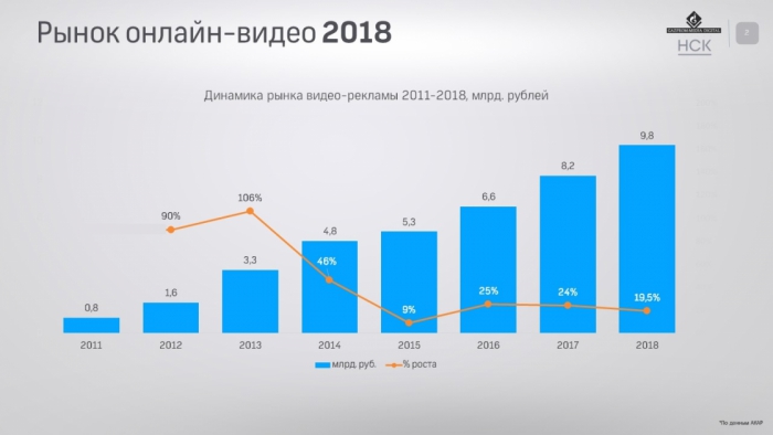 В 2018 году рост замедлится и составит около 20%, что не помешает рынку видеорекламы вплотную приблизиться к отметке в 10 млрд рублей, как прогнозировала ранее генеральный директор Gazprom-Media Digital Наталья Дмитриева.