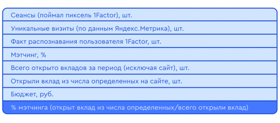 Для решения задачи мы установили на страницах сайта пиксель от OneFactor, который умеет мэтчить cookie пользователя и данные оператора с привязкой к UTM источника перехода. Мы настроили безопасный метод передачи шифрованных данных в контур банка. Так удалось вычислить пользователей, которые открыли вклады в период рекламной кампании, и отследить офлайн-продажу до конкретных источников на уровне ключевых слов и рекламных кампаний.