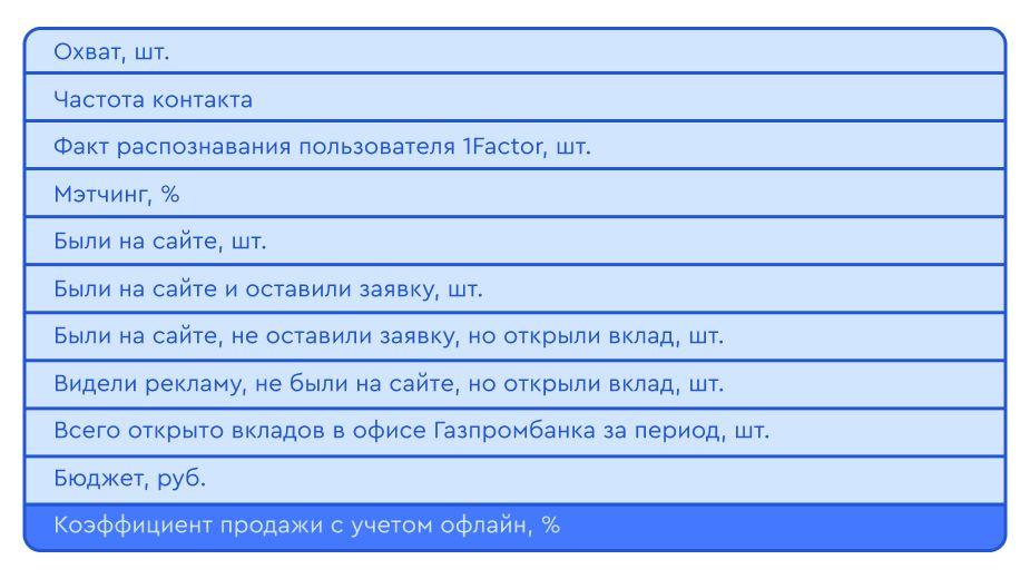 - Замерить коэффициент уникальных пользователей, которые контактировали с медийной рекламой и в дальнейшем открыли вклад без посещения сайта.