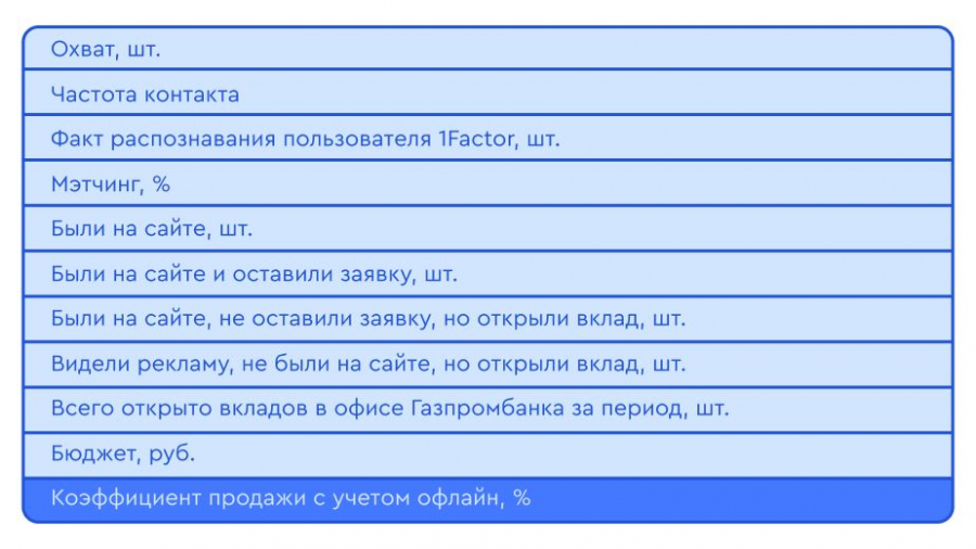 Реализация. Вместе с коллегами из OneFactor и Adriver мы доработали параметры данных для трекинга СРМ-кампаний и внедрили его в креативы. Они настроили дополнительную привязку к точному времени показа и IP пользователя. Далее обогатили CRM-данные банка информацией о показах, медиаинвентаре, частоте контакта, данными о креативах и рекламных затратах по каналам. Помимо этого, мы построили сквозную воронку «медиа — перформанс — органика — офлайн продажа». Для подсчёта её эффективности измеряли следующие показатели: