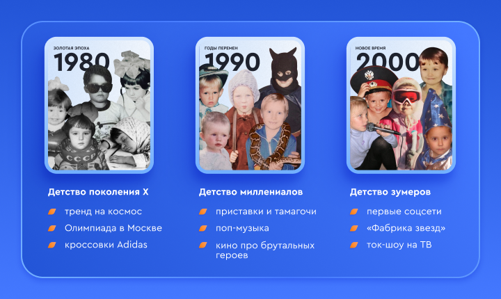 Запустив машину времени, можно отправиться в три эпохи: 1980-е — детство поколения Х, 1990-е — детство миллениалов и 2000-е — детство зумеров.