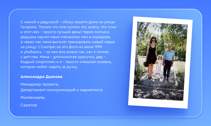Мы собрали уникальный UGC-контент, который переупаковали для создания полноценного спецпроекта. Проанализировав 313 полученных фотоисторий, отобрали 15 наиболее ярких, в которых сотрудники рассказывали, кем они мечтали работать в детстве. Так появился проект «Машина времени в детство». Благодаря фокусу на профессиональные мечты и формату «было/стало» в нем мы сделали акцент на роли работодателя, помогающего раскрыть потенциал сотрудников.