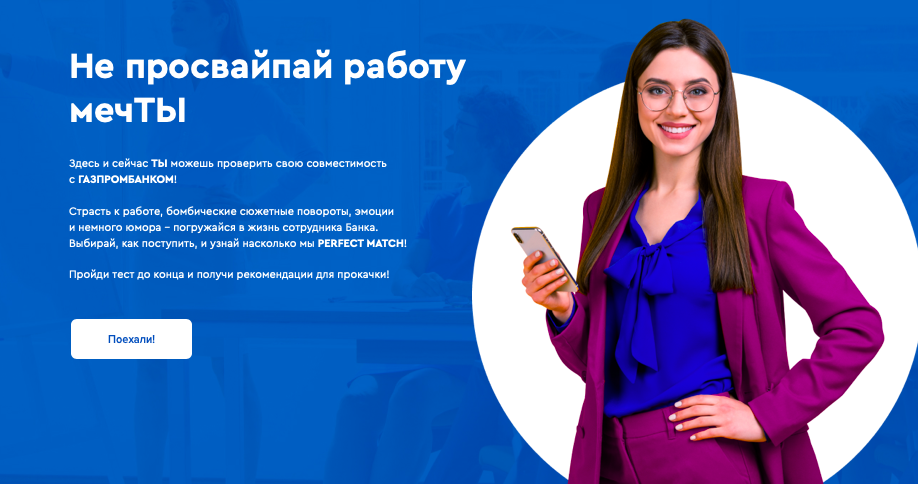 Тест составлен на основе четырёх ценностей «Газпромбанка»: проактивности, открытости, ответственности, участия и внимания к людям. К каждой из ценностей относится ряд компетенций и навыков, непосредственно связанных с вопросами. По результатам прохождения теста пользователь понимал — match или нет у него с банком, вольётся он легко в коллектив и нашу корпоративную культуру или нет. А бонусом он получал полезные рекомендации (ссылки на подкасты или видеоролики, которые помогают прокачать проседающие скиллы).