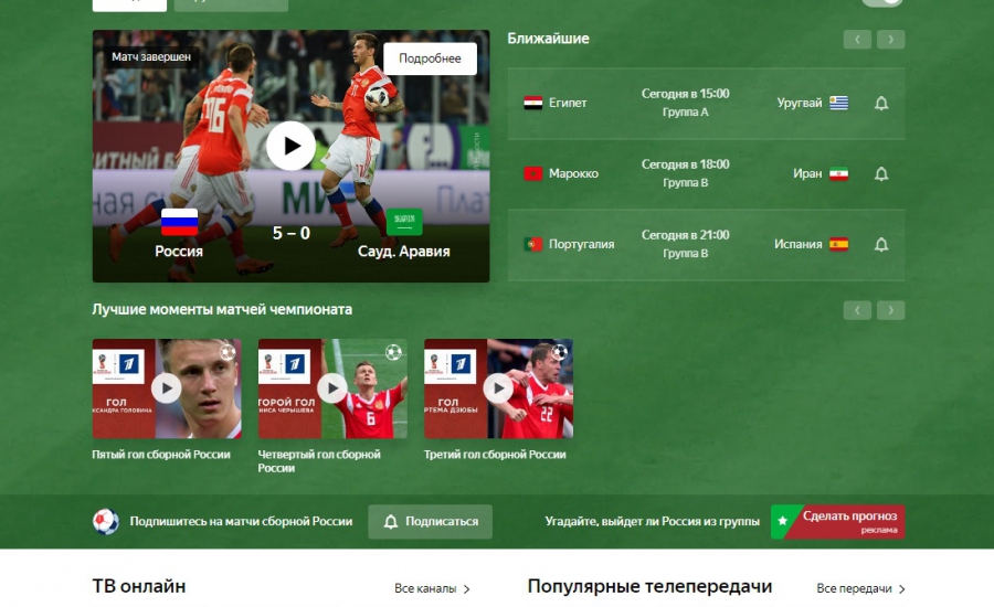Российские телеканалы, в числе которых вещатели ЧМ-2018 «Первый» и «Матч ТВ», больше года показывают свой эфир онлайн на главной странице Яндекса в разделе «ТВ онлайн». Трансляции матчей «Первого канала» и «Матч ТВ» на Яндексе зависит от договоренностей телеканалов с FIFA, пояснили в интернет-компании. Ранее Яндекс транслировал на главной прямые эфиры и записи соревнований Олимпиады 2018 в Пхёнчхане. Тогда у интернет-компании был прямой договор с «Телеспортом», владельцем прав на вещание Игр в России.