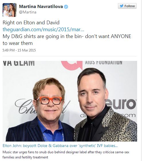 Певец Элтон Джон призвал бойкотировать продукцию Dolce&Gabbana и заявил, что больше никогда не наденет их одежду. «Ваше архаичное мышление так же отстало от времени, как и ваша мода», — написал артист в Instagram с хэштегом #BoycottDolceGabbana.