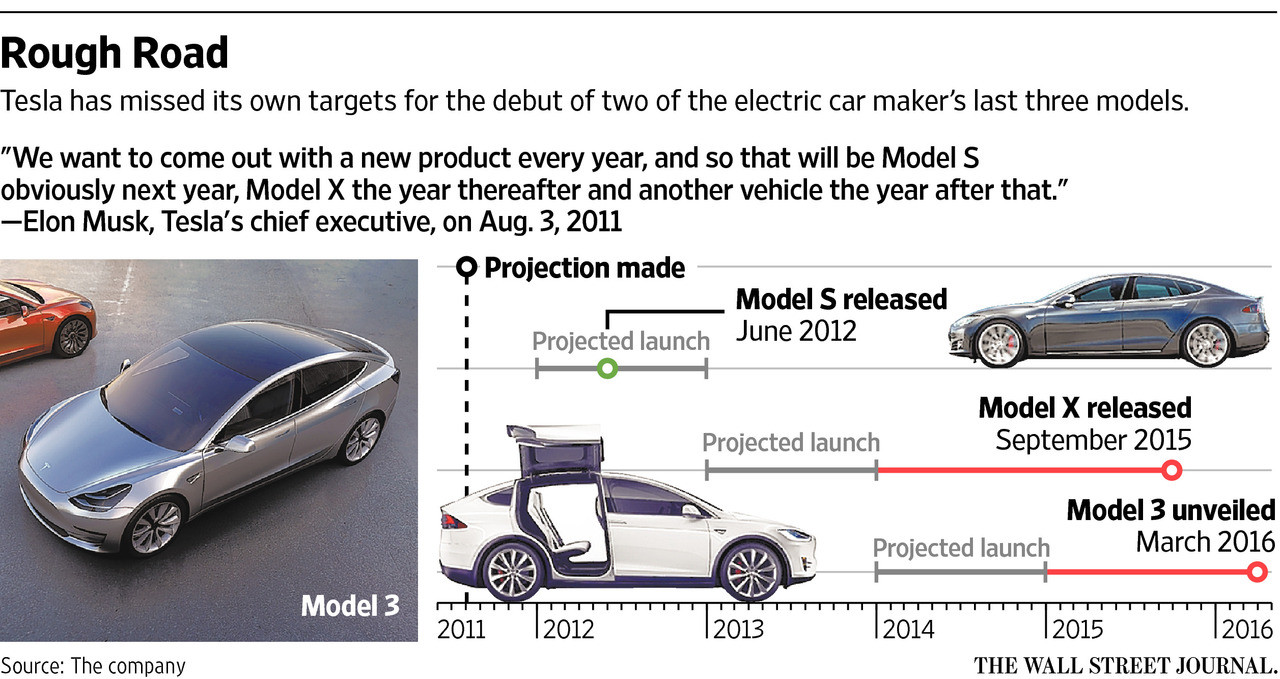 В мае 2016 года Илон Маск сделал заявление о том, что серийная сборка «бюджетника» Model 3 начнется 1 июля следующего года. Вместе с тем спустя всего лишь два месяца в своем интервью журналистам The Wall Street Journal он так и не смог подтвердить собственный прогноз.