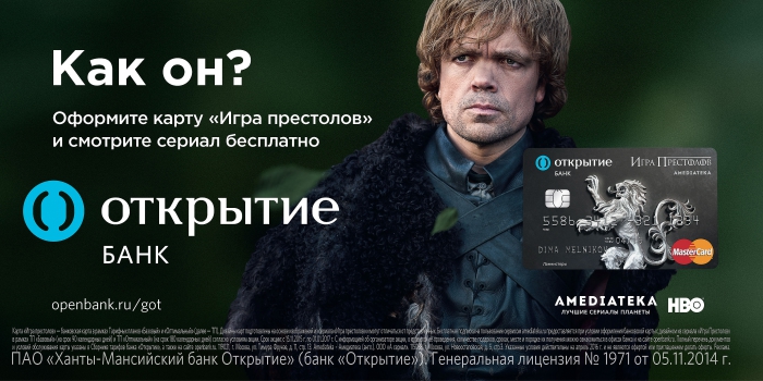 Как сообщили Sostav.ru представители финорганизации, цели рекламной кампании традиционны – поддержка знания бренда банка и выстраивание позитивных ассоциаций с банком. В связи с этим клиентам "Открытия" доступно еще одно предложение: люди, оформившие карту, получают возможность смотреть сериал «Игра престолов» бесплатно на Амедиатеке.