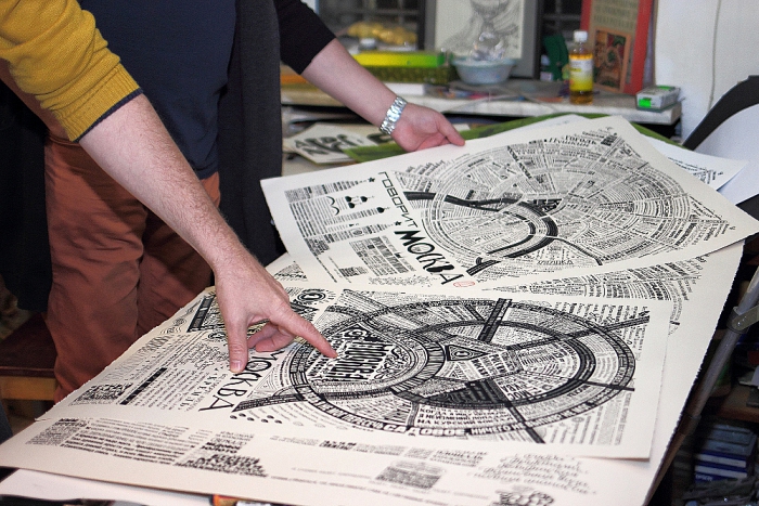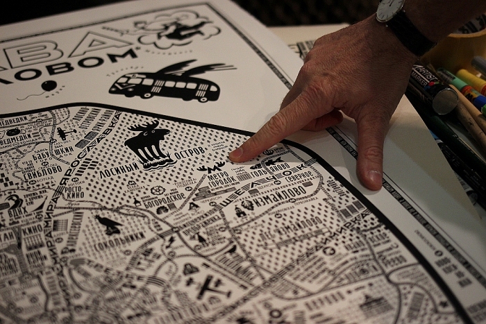 Юрий: Когда была сделана «Москва одним словом», я, наконец, дошел до МКАДа. Предыдущие карты все были в пределах Садового кольца. После этого была сделана, (она сейчас еще не опубликована, потому что фактически она будет опубликована на стенах бизнес-центра размером 11 на 7 метров) карта, которая будет называться «Москва — город мастеров». Карта со всеми ремесленными слоганами, которые были в Москве, продуктами их работы, инструментами и т.д. Это все нарисовано на карте. Есть вероятность, что она выйдет еще в отдельных листах, где-нибудь ближе к зиме этого года. Это вот новое, то, что действительно в работе. Что будет после этого, мне трудно рассказать. Потому что это московская тема, все-таки уже 6-7 карт сделано. Какие города будут дальше — надо думать.