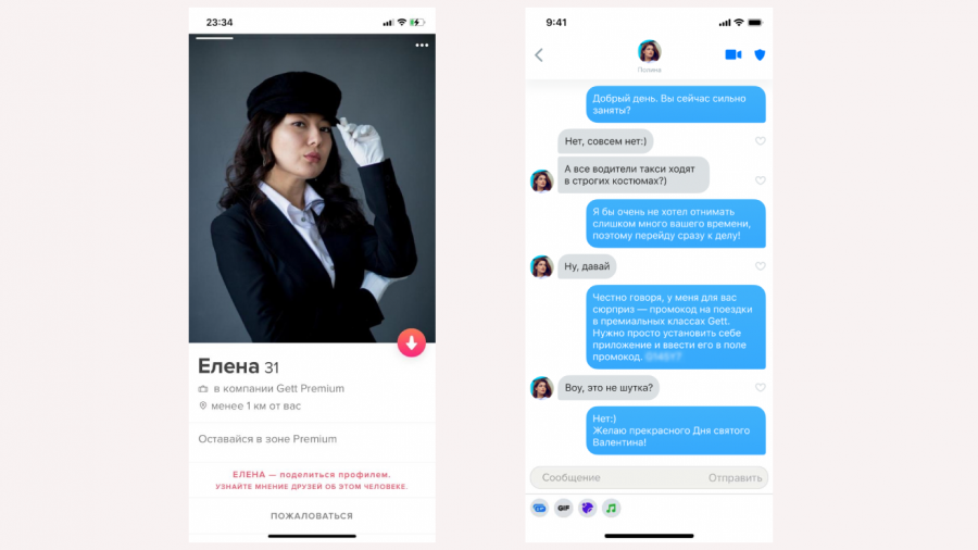 Пользователей, которые только ищут свою любовь в Tinder, бизнес-такси отвезет на свидание. Для тех, у кого уже есть пара, Gett уже провел акцию «Gett your Valentine», в рамках которой подарил сертификаты на ужин в ресторане, также была доступна доставка, если победитель решил не посещать публичные места.