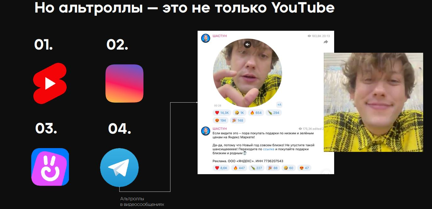 В итоге альтроллы стали аналогом официальной рекламы на YouTube и других площадках после событий 2022 года. Благодаря вертикальным форматам рекламные вставки брендов могут легко интегрироваться в повседневное медиапотребление пользователей. За счёт вирусного потенциала и относительно низкой стоимости продакшна они стали рентабельной заменой классическому продвижению. Shorts и VK Clips чаще всего не проматывают, так что аудитория точно посмотрит рекламный ролик и не будет им раздражена.