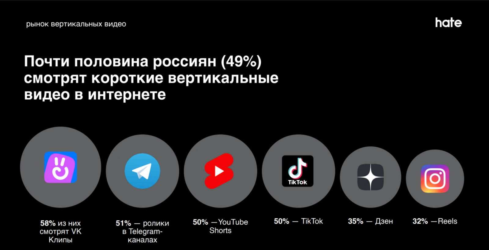 Короткие форматы почти обогнали длинные. Они неотъемлемая часть повседневного интернет-потребления: простые, доступные, информативные, но весёлые — комбо, подходящее для современного ритма жизни. Согласно исследованию «Анкетолога» вместе с Sixth Sense, 49% россиян смотрят короткие вертикальные видео в интернете.