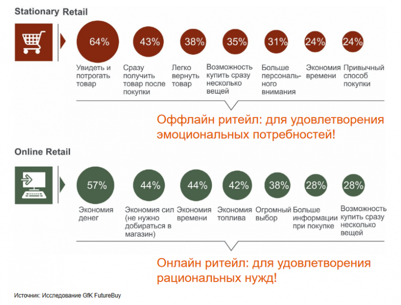 Использовать преимущества онлайн и оффлайнканалов. Несмотря на рост значимости онлайна, оффлайн канал остается очень важным. Онлайн ритейл служит для удовлетворения рациональных нужд. А оффлайн ритейл — для удовлетворения эмоциональных потребностей. Интересно отметить, что молодежь, которая, казалось бы, выросла в эпоху цифровых технологий и всеобщей мобильности, и должна все делать в онлайн, на самом деле попрежнему ценит многие преимущества, которые дают реальные магазины.