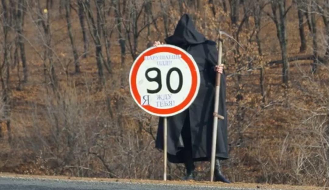 Главным действующим лицом акции стал человек, переодетый в старуху с косой и державший в руках знак «Ограничение максимальной скорости». Кроме того, на знак была нанесена надпись: «Нарушаешь ПДД? Я жду тебя!».