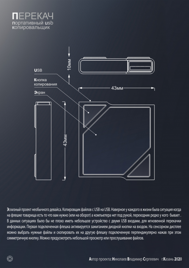 Второе место досталось Владимиру Николаеву и его работе «Портативный USB-копировщик «Перекач» — это копировщик файлов с USB на USB. На сенсорном дисплее можно выбрать нужные файлы и скопировать их на другую флешку.
