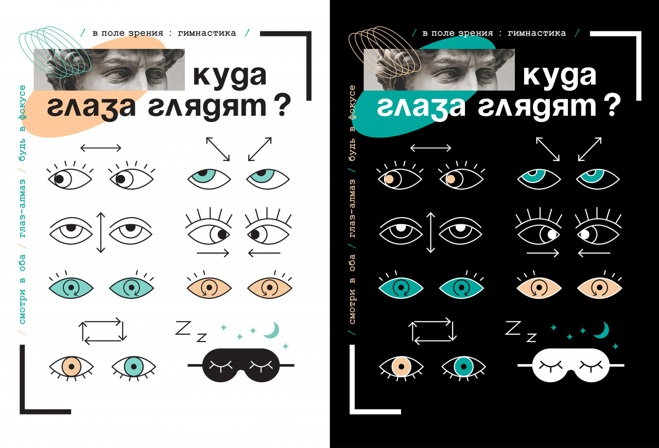 Первое место заняла Ксения Поддубная с работой «В поле зрения». Принт представляет собой схему-гимнастику для глаз, демонстрирующую несколько основных упражнений для расслабления глазных мышц.