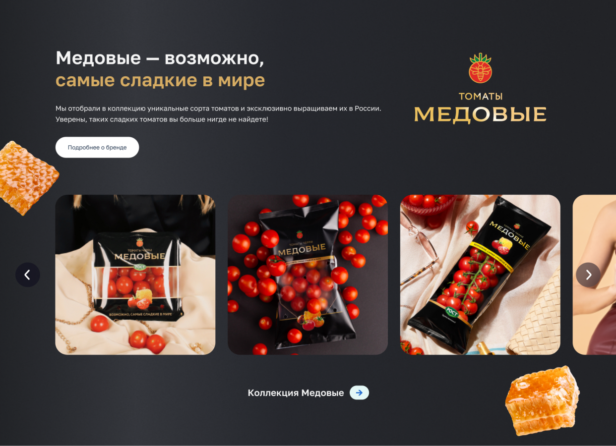 Во-вторых, на сайте доступна информация о всех брендах РОСТа — это отдельные страницы, на каждой из которых есть эдьютейнмент: полезные факты о продукте и интересный интерактивный блок для пользователя. Например, на странице сладких томатов «Медовые» пользователь может выбрать красные или оранжевые, чтобы чтобы увидеть всю палитру вкуса, описанную сомелье. А на странице томатов «Сладкая ягода» есть рандомайзер, он подскажет сорт и познакомит с разными вкусами томатов.