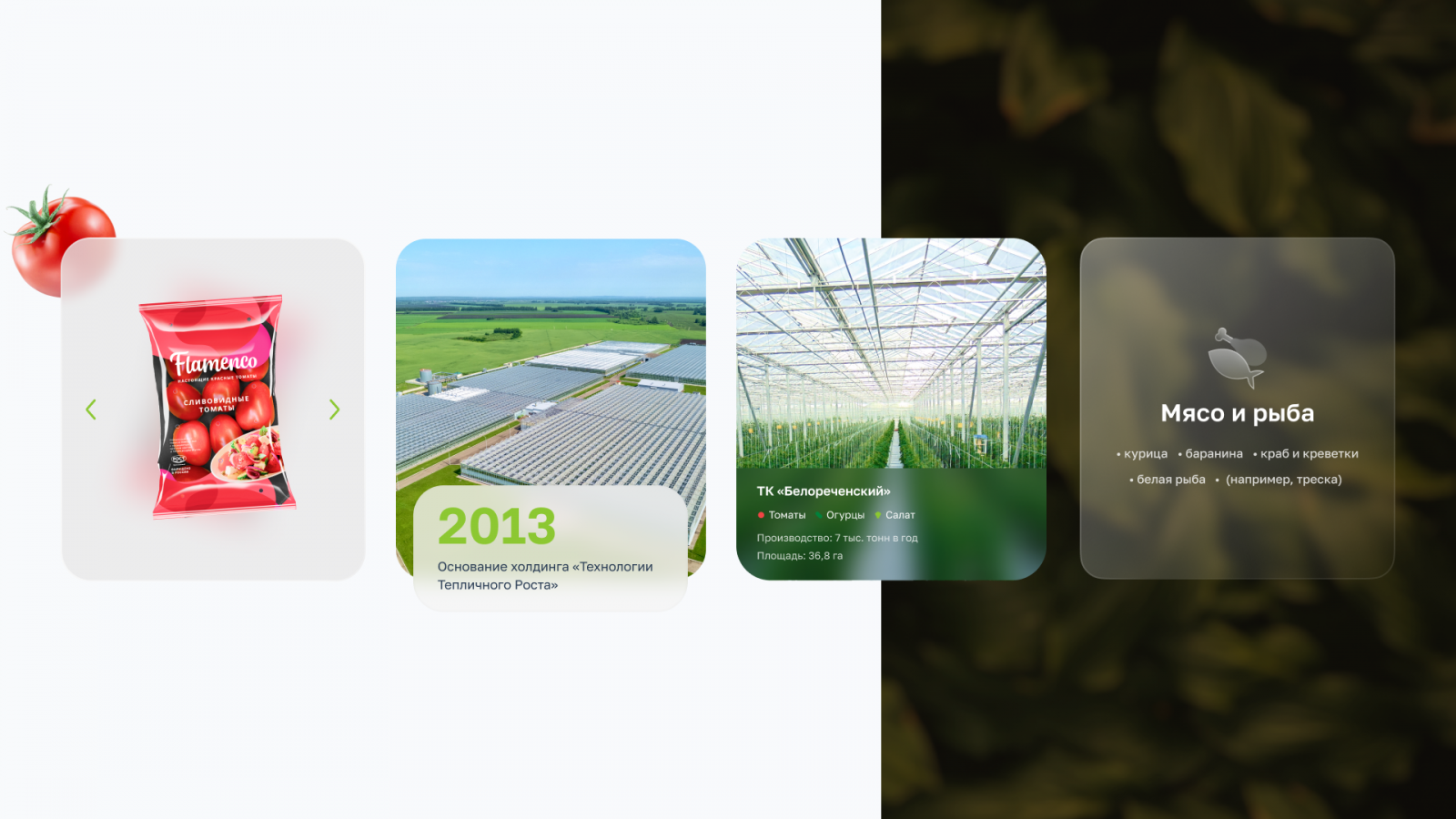 Дополнительно ассоциацию с теплицами специалисты подчеркнули через стекло: активно использовали эффект матового стекла в плашках, иконках и других элементах сайта. А также через яркую палитру, передающую цвета зелени, овощей, воды и солнца.