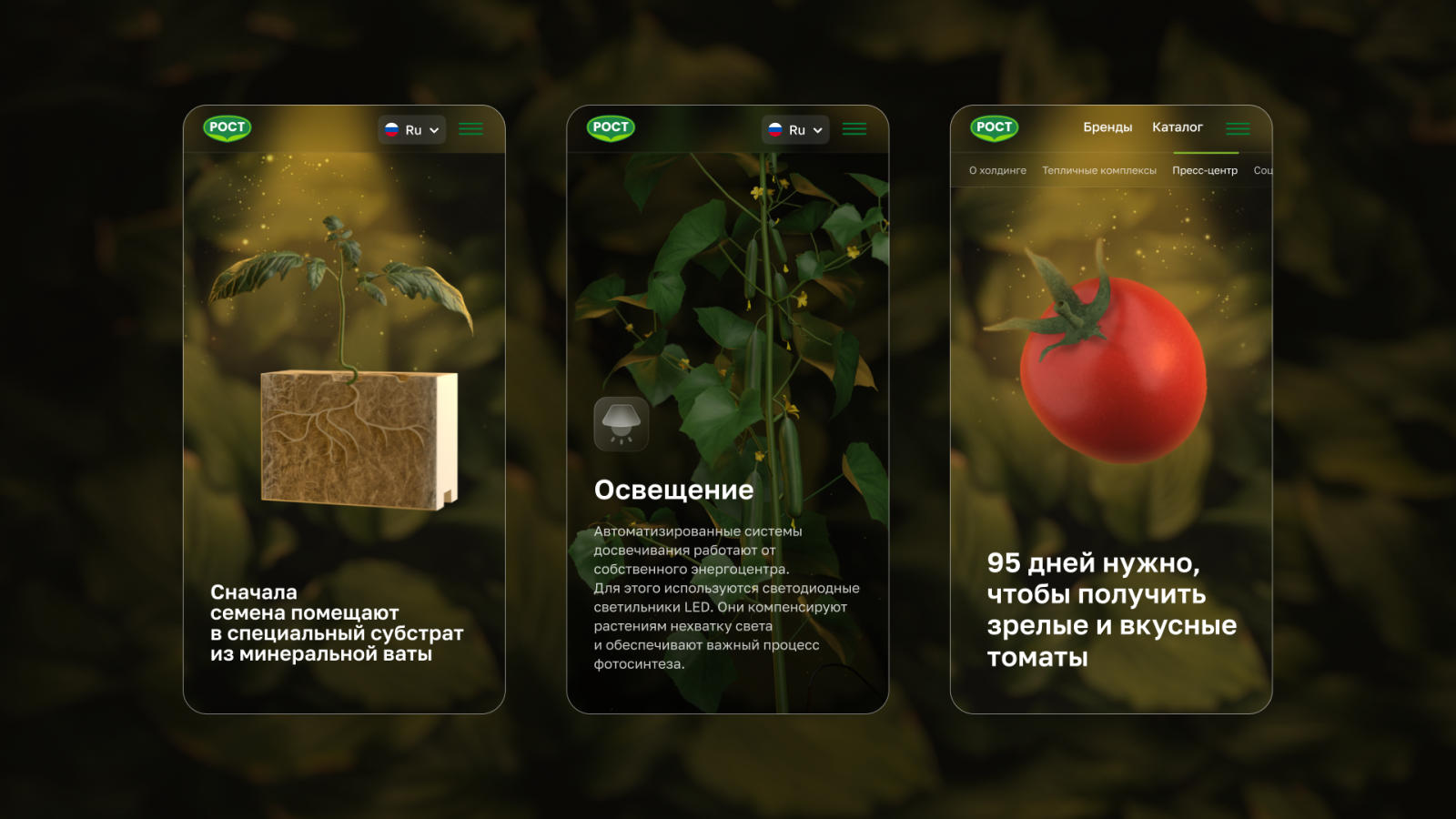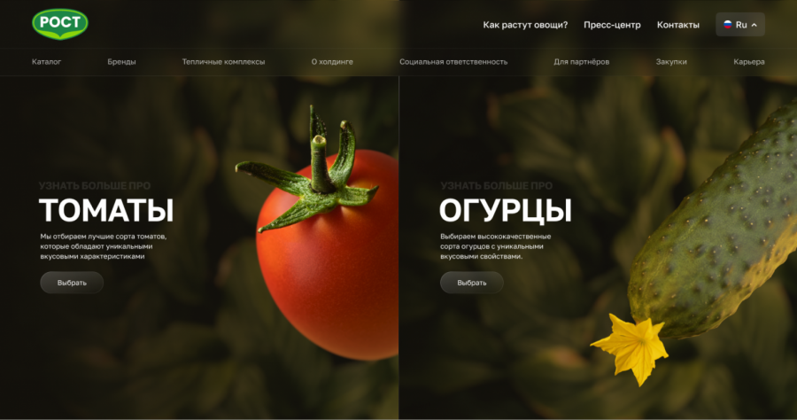 Основаная идея. РОСТ выращивает овощи в теплицах, поэтому для главной страницы сайта команда приняла решение создать ощущение присутствия в такой современной теплице. «Мы стремились произвести вау-эффект и воссоздать атмосферу такой, какая она есть: показать теплый свет, весь процесс роста овощей и контролируемые условия выращивания и созревания близкие к естественным, таким же, как в природе», — поделились представители Digital Lab.