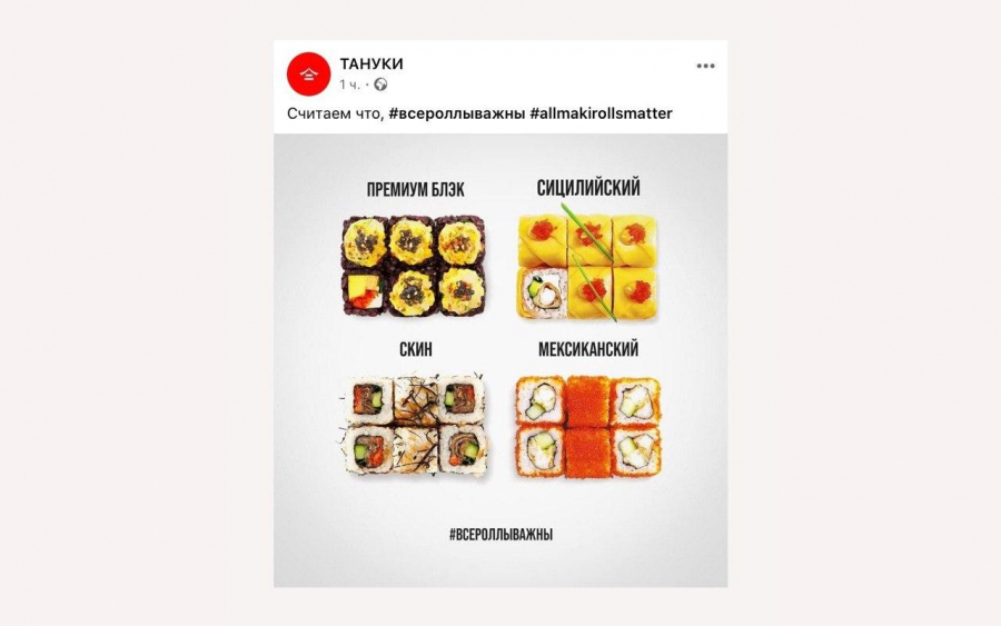 В начале июня «Тануки» выпустила еще одну рекламу, которая вызвала обсуждение. В ней изображены разные роллы с подписями «премиум блэк», «скин», «мексиканский», «сицилийский». Внизу размещен хэштег #всероллыважны (по аналогии с Black Lives Matter — выражением, которое используют в борьбе с расизмом).