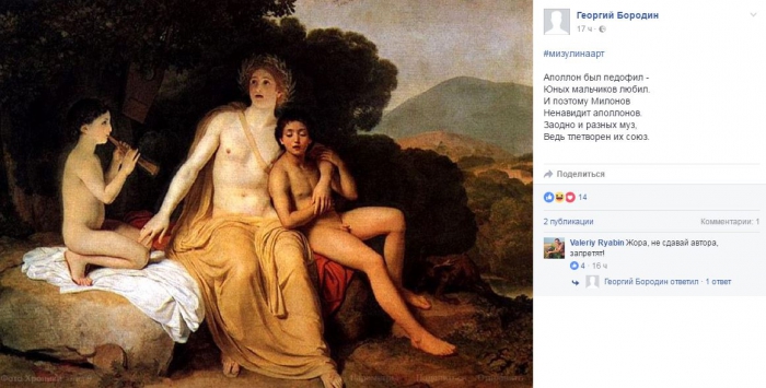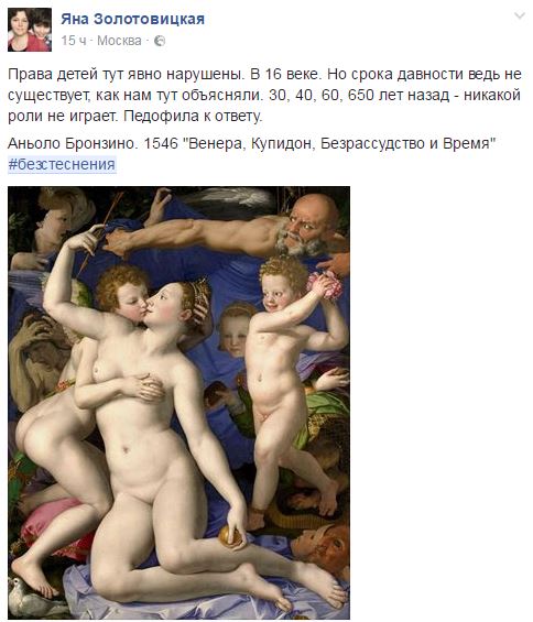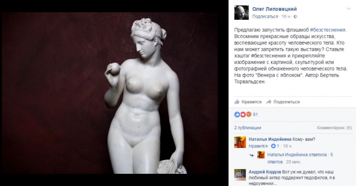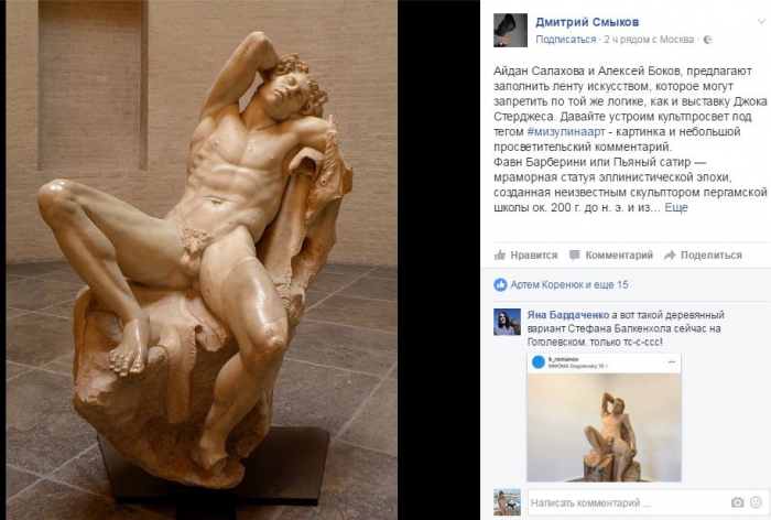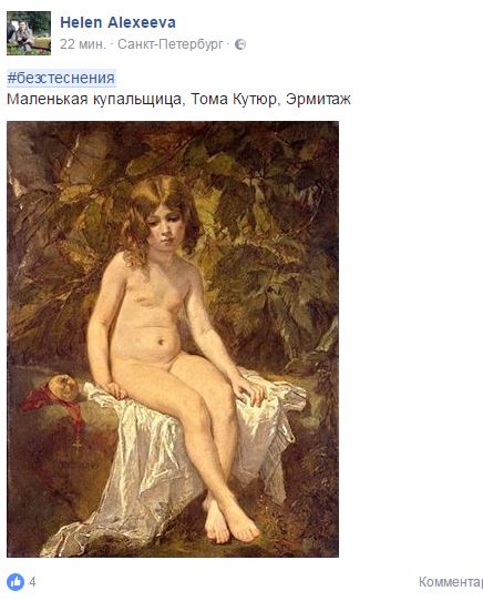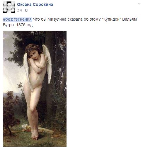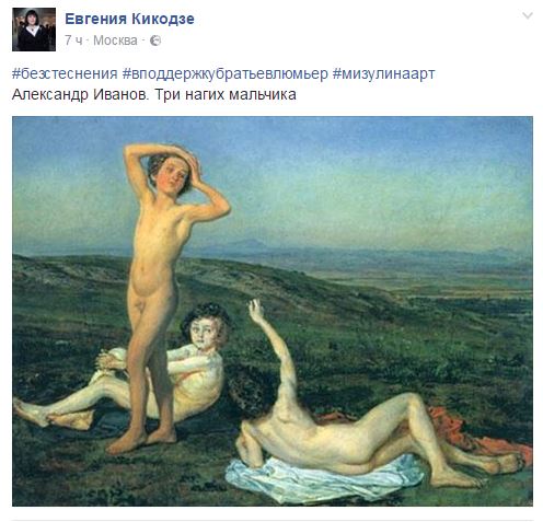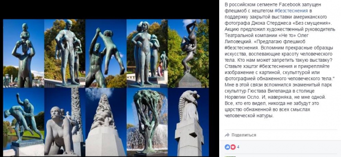 В ответ на закрытие выставки пользователи Рунета запустили флешмоб, в рамках которого публикуют произведения искусства с хэштегами #безстеснения и #мизулинаарт. Таким образом ревнители морали добились противоположного эффекта: соцсети заполнила обнаженная натура. Протестующие публикуют картины, скульптуры или фотографии, которые свидетельствуют об интересе художников к красоте человеческого тела, в том числе детского.