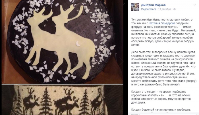 Одежда и аксессуары с подобным рисунком уже давно пользуются популярностью у молодой аудитории. Однако результат удивил Маркова: «Это не олени любви, это рогатые коровы мнутся напротив друг друга. Ладно если б РАЙПО отказалось оливье стругать, но это вообще-то частная кондитерская, с тортами за два косаря».